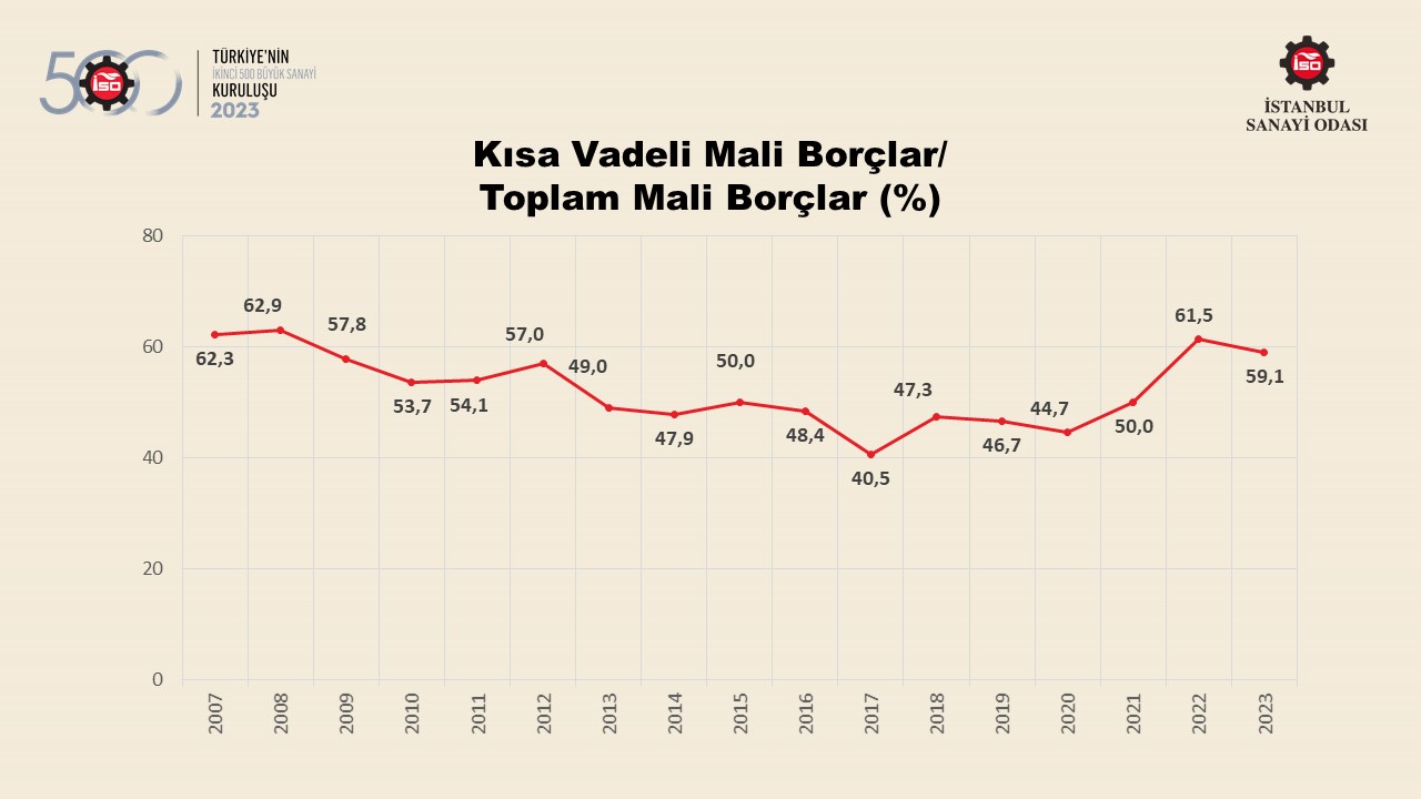 Şöyle ki 2021 ve 2022’de artış eğilimi sürdüren kısa vadeli mali borçların toplam borçlar içindeki payı, uygulanan sıkı para politikalarının kısa vadeli mali borçlanma imkanlarını azaltmasının da etkisiyle 2023’te yüzde 59,1’e, 2024’te ise yüzde 57,4’e geriliyor. Ancak yine de bu oranlar 2021 ve öncesine göre oldukça yüksek düzeylerde kalmayı sürdürüyor.