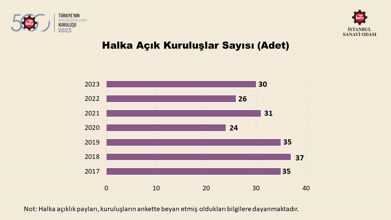 İSO İkinci 500’de halka açık kuruluşların sayısı 2017-2023 arasında iniş çıkışlı bir seyir izledikten sonra 2024 yılında da artış eğilimini sürdürdü. 2023 yılında 4 adet artışla 30’a yükselen halka açık kuruluşlar sayısı, 2024 yılında 9 adet daha artarak 39 ile en yüksek seviyesine çıktı.